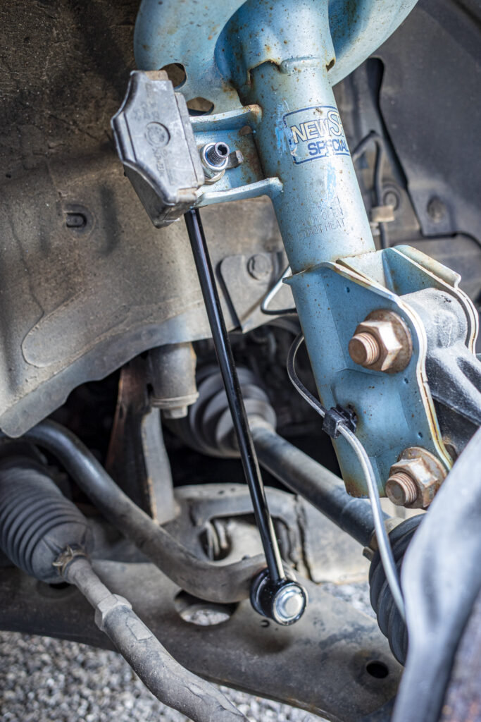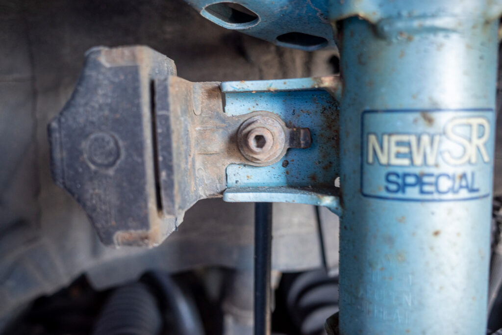 ロッドの上側はダンパーシリンダーに、下はスタビライザーにナットで止められているだけなので交換作業自体は大したことはない。ただ、場所が場所なだけに汚れでネジが固着していて緩めずらそう。