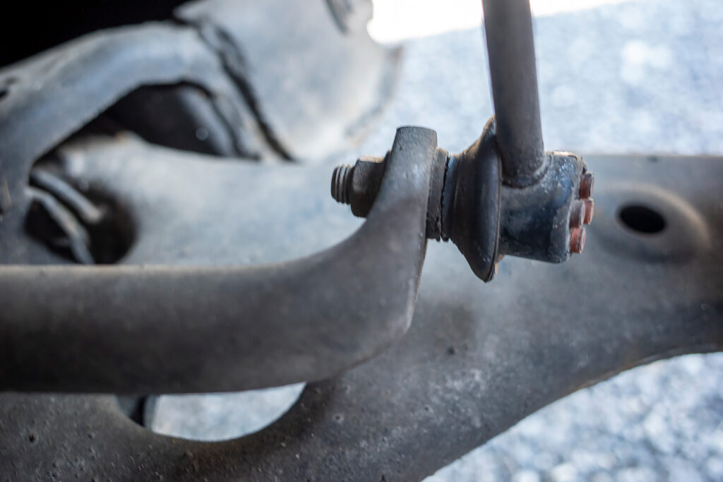 リンクロッドはサスペンションが伸びる方向にテンションが掛けられていて(引っ張られていて)、ナットを外してもロッドはすんなりとは外れてくれない。取り外すためにはサスペンションアームをジャッキで下から持ち上げてサスペンションを縮めてそのテンションを抜いてやる必要がある。