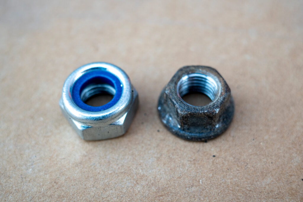 上側のナットはこちらを向いて止められているため、比較的外しやすそうなので、先に裏側を向いている下側のナットの取り外し作業から取り掛かる。