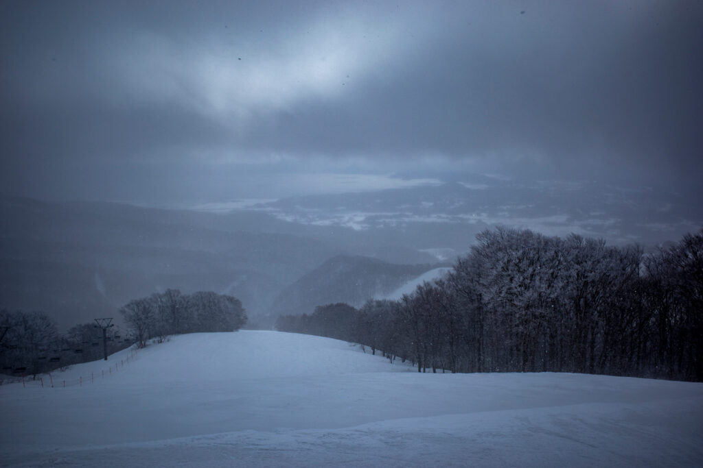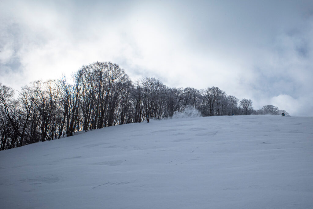 さすがにこの斜度のオープンバーンだと風はモロに当たっていただろう。見るからに硬そうな斜面に、うっすらと新雪が載っているように見えたので、ほとんど期待していなかったのですが、滑ってみれば底突きしてもなんとか踏みとどまれる程度の硬さで、吹き溜まりではくるぶしくらいまで埋まる乾いた新雪を味わうことができた。