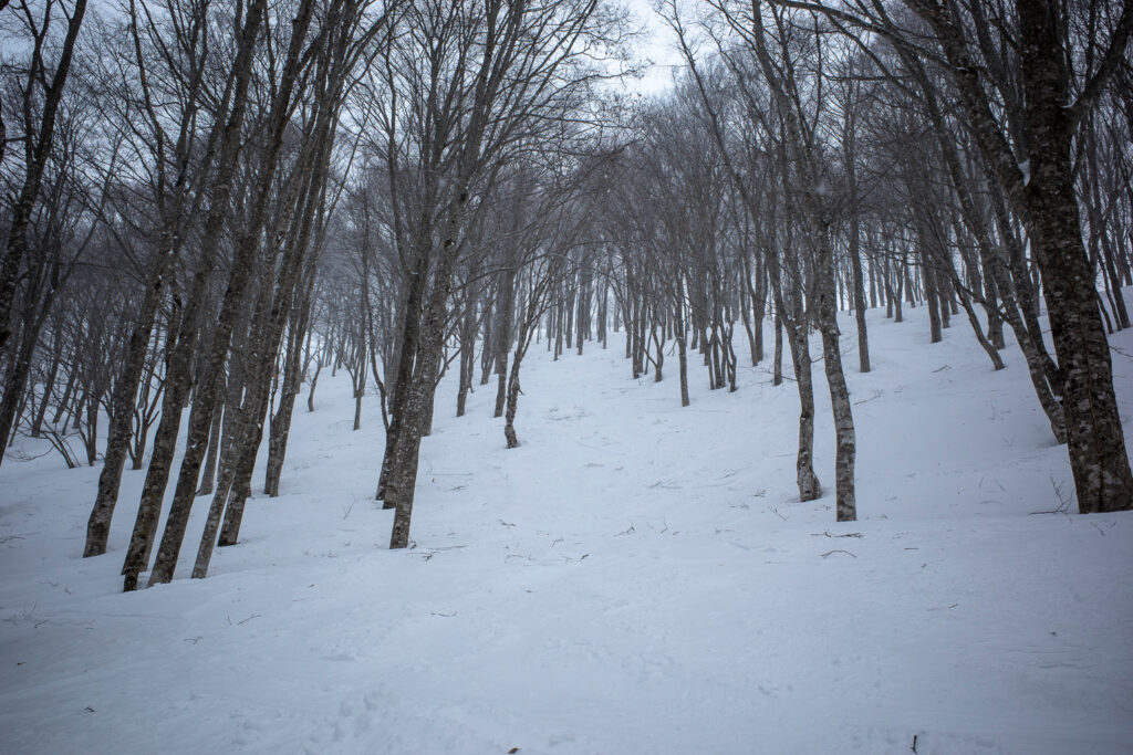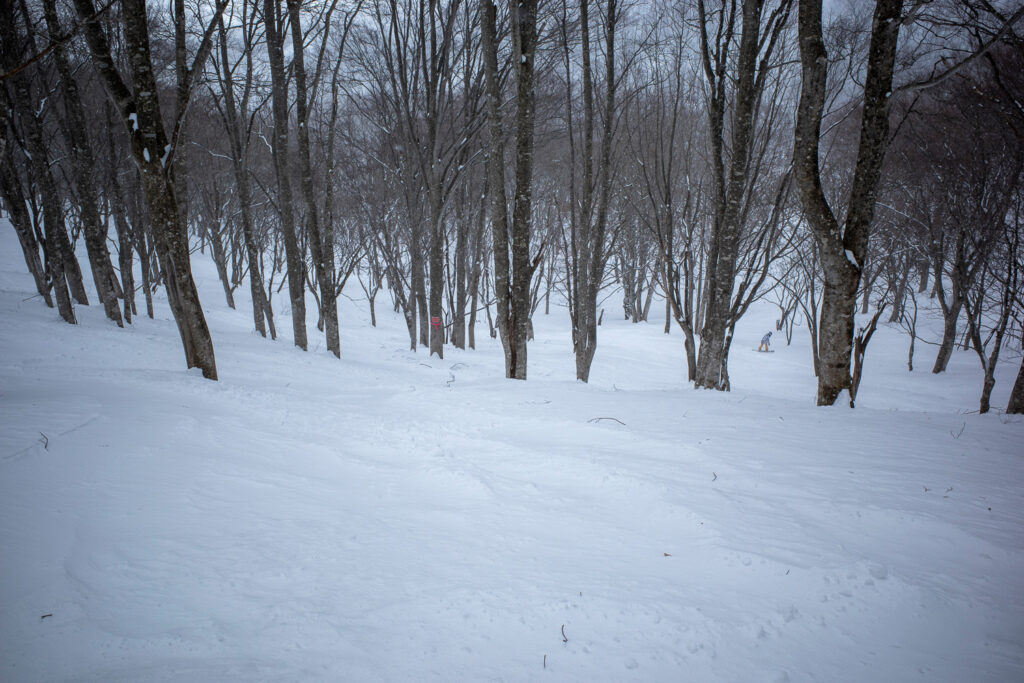 北エリアの新雪が意外と良かったので期待していたのですが、南エリアはあまり積らなかった様子で、カチカチではないものの、滑って楽しいと思える雪面は、林の中にはほとんど残されていなかった。残念。