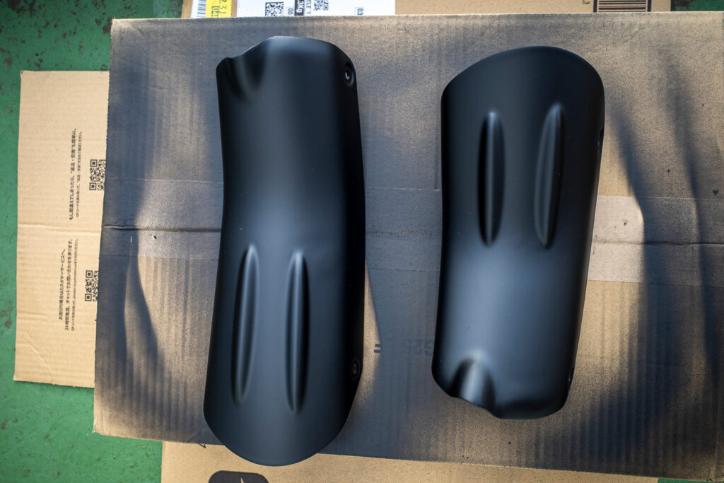 マットブラックと言っても、色味は大きく分けて青系と茶(赤)系とあるので、塗った箇所が並ぶと違いが目立ってしまうこともあるが、今回はエキパイと同じ塗料なので色の統一感もバッチリ。
