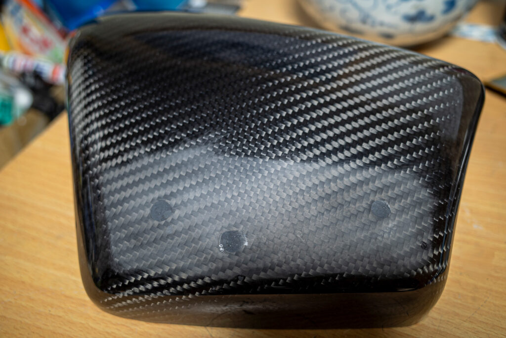 穴を塞いだところでこのままカーボン地を残す誘惑にも駆られましたが、インシュレーターカバーの水ぶくれと同様、穴を塞いだ痕が絶対に気に入らなくなり、どうせ塗装し直すことになるだろうから、せっかくのドライカーボンですが塗りつぶしてしまうことにした。