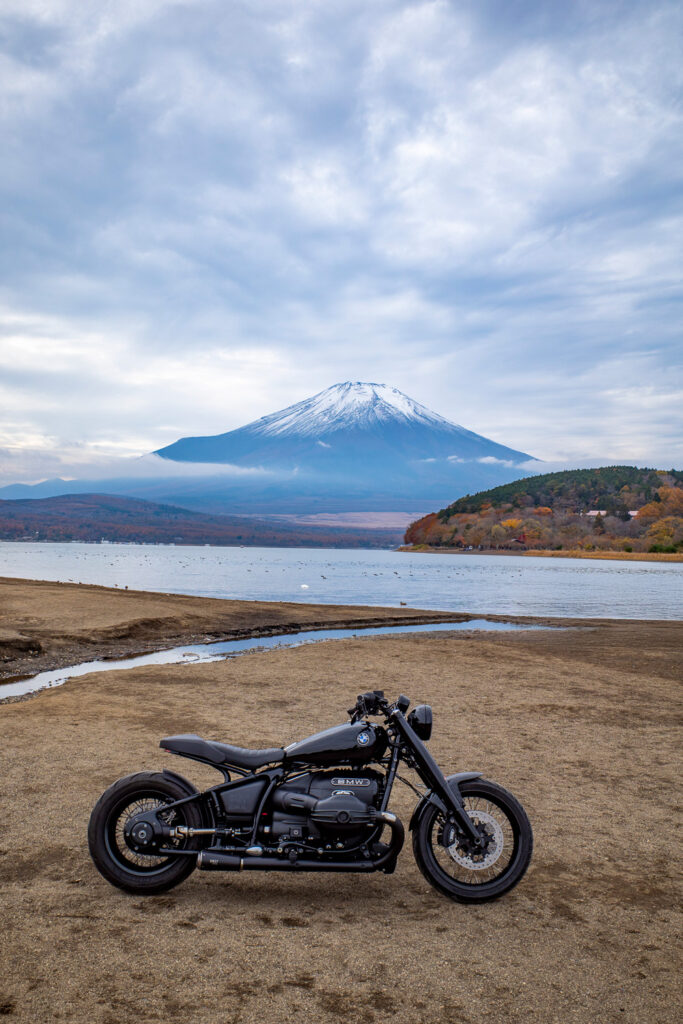 ここにわちゃわちゃといた外国人観光客は、あまりにも風情に欠けるので、消しゴムマジック(Photoshopは「生成塗りつぶし」)で消させていただいたが、この時期に遠路はるばる日本までやって来て、秋の山中湖にいるなんて。と、むしろ感心させられる。