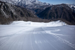 遅れて営業が開始される『ホテル第5リフト』を待つため、その下の圧雪斜面『ホテルBコース』を1本滑ることにした。と言うのは半分ウソで、ゴンドラから見下ろした圧雪コースにヨダレが止まらなかっただけだ。