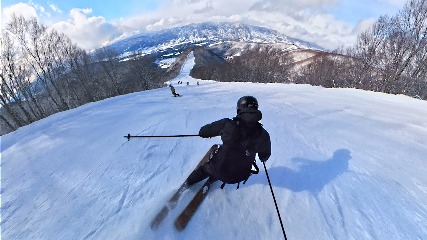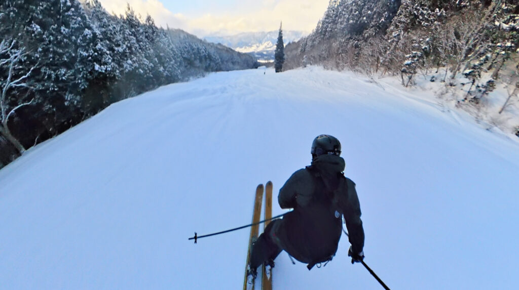 しかもコブ斜面なので、面で新雪を受けようとしてしまうと簡単に底突きしてそのまま尻餅をついてしまう。