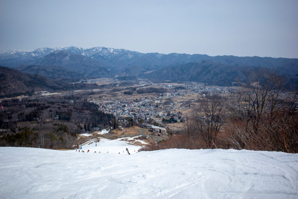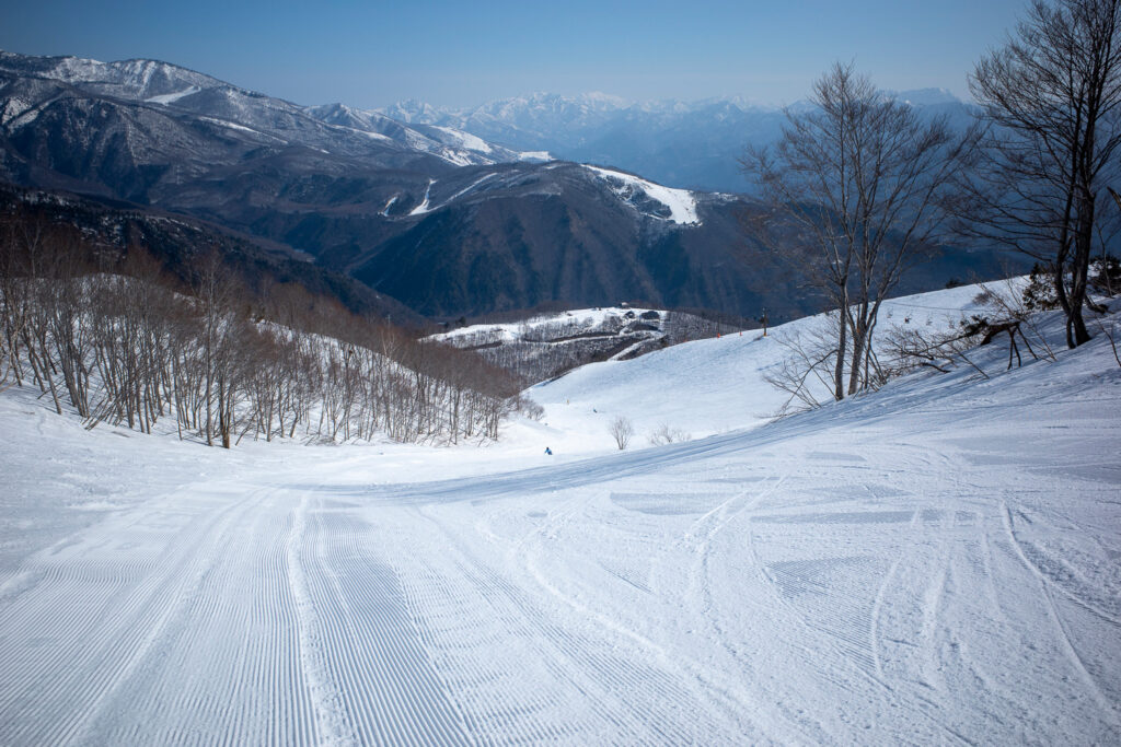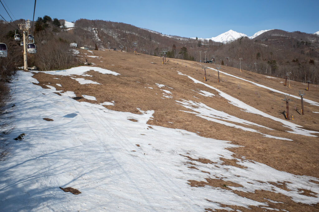 中段を過ぎると、ところどころにストップスノーが混ざりはじめるため、足を取られないように直線的なラインを取らざるを得ない。もちろん自動的にブレーキがかかるので、直滑降プラスアルファでも操作はかなりズボラにできる。これはこれで実に春らしい乗り味。