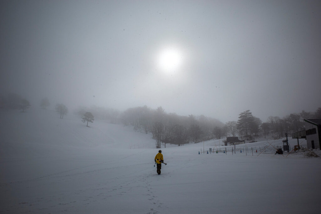 そして翌朝、斑尾スキー場の駐車場で目が覚めると、雪は降っていましたが、水分多めで積もるような雪ではなかった。