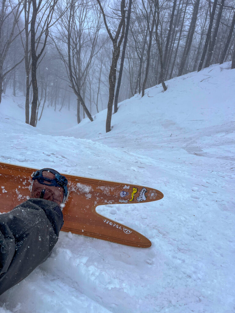 そのため、期せずして両者の滑走性能を比較することができたのですが、シャバ雪の上に新雪が載るこうした状況では、SPRING BRAKEの性能は圧倒的でありました。