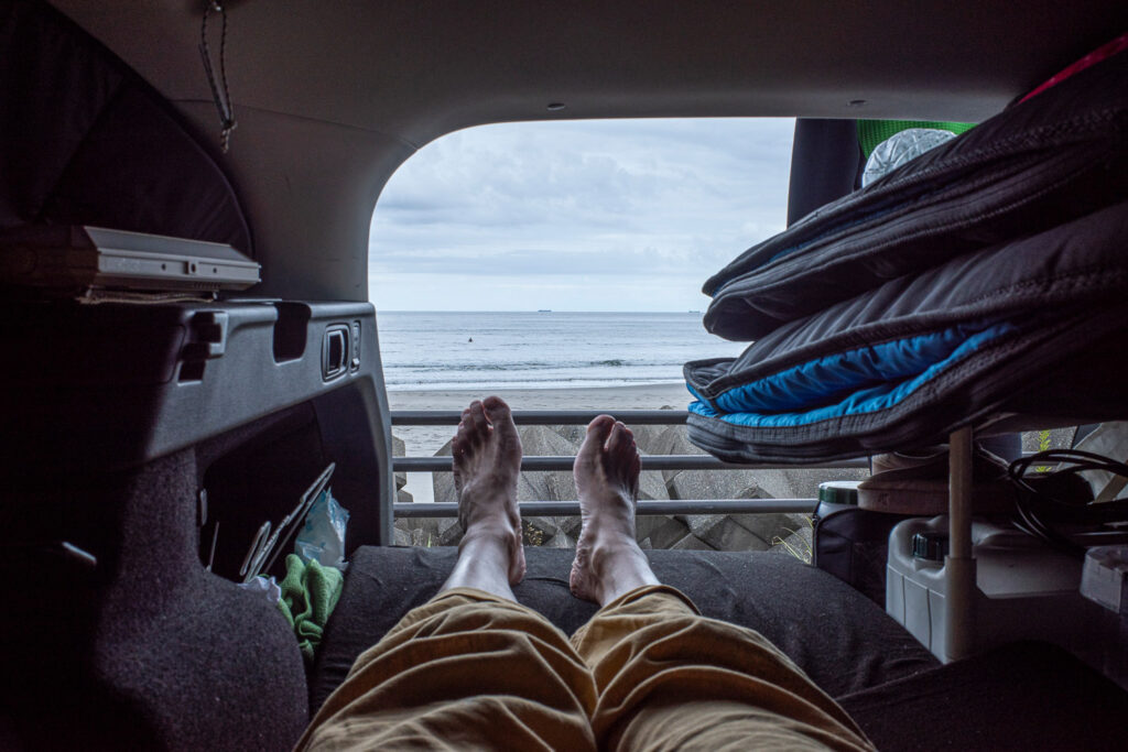 夜の外気温は20度ほどで車外は涼しいを通り越して肌寒いほどでしたが、それでも車内に風が通ることもなく、そこそこ蒸している。もちろんEcoFlow WAVE 3を使わせていただき、ほどよい疲れと酔いに任せてぐっすリープ。