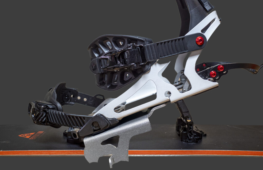 KARAKORAMの純正クランポンはバインディング本体の底面に直に装着されてしまうため、ヒールライザーを上げるような斜面だと、一緒にクランポンも上がってしまうため、クランポンの歯は少ししか雪面に刺さらない。