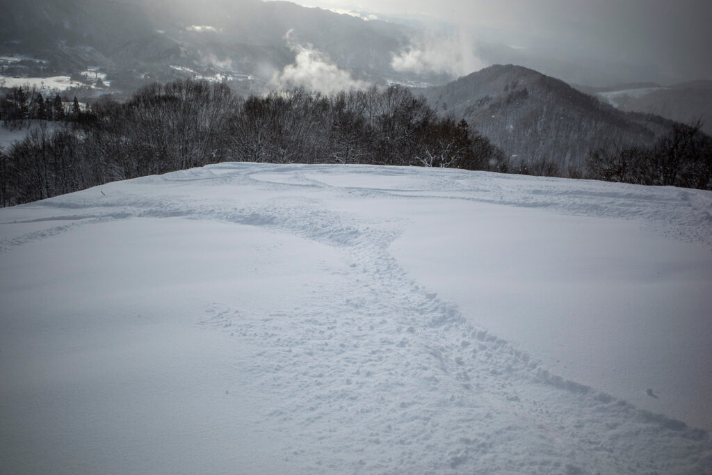 ただ、前日まで踏み締められた硬い雪面に乾いた軽い雪がのっているので滑空感は低めではある。
