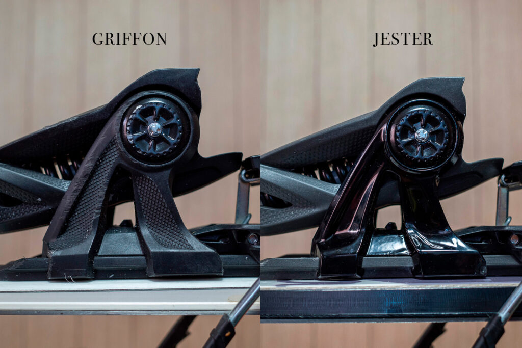 GRIFFONの土台部分がプラスチック製であるのに対し、JESTERは高荷重に耐えるために、ご覧のようにヒールの台座部分と、トゥの爪の部分がスチール製とされる。