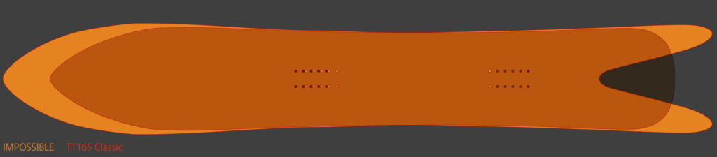 もちろんTTより長くワイドなトップによって、豊かなサイドカーブをもつシェイプ。そして浅めとはいえキャンバーを持つことの利点を活かすことで、TTミズメヒノキよりもずっと、溜めた荷重を雪面に放出しやすくなるなど、この硬さが整地バーンでのカービングにも好影響をもたらす可能性も連想させてくれる。
