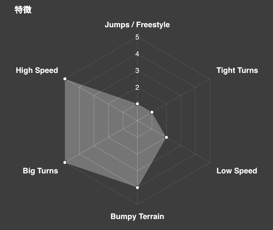 そちらの説明書きには「凝縮された山岳エリアでは、未知なるナチュラルバンクや雄大なカールなどが待ち構えている。超困難なチャイニーズダウンヒルとは異なる、美しく描くラインをスケッチするためには、耐えぬく突破性とブレーキ性能を重視したヘビーウエイト対応モデル(が必要となる)。」とあり、やはりIMPOSSIBLEのハードフレックス化は、際どい場面での突破性や安定性の確保が主眼であることが窺える。