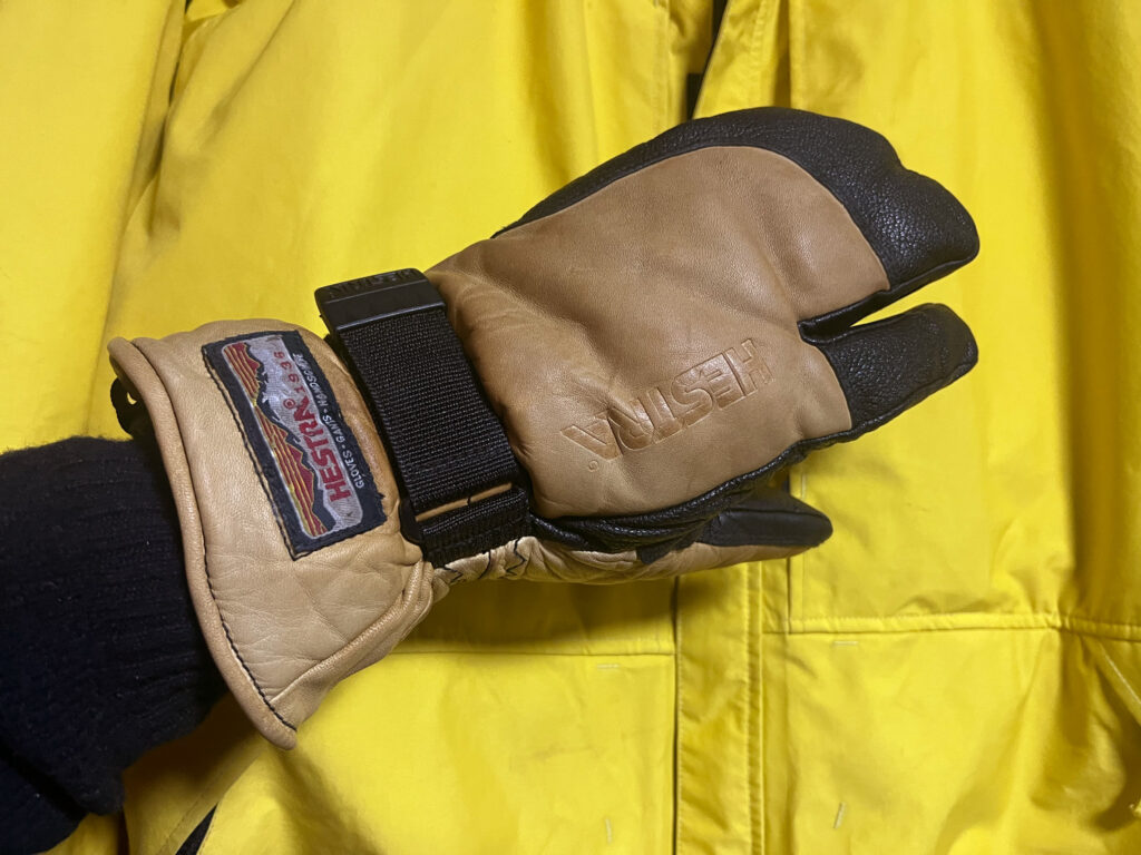 この30年以上も前に苗場スキー場内のショップでたまたま見つけて一目惚れして買った、なめし色と黒の切り返しが施された、私にとってはじめてのHESTRAとなるこの3-Fingerは、今でも手放せずに手元に残している。