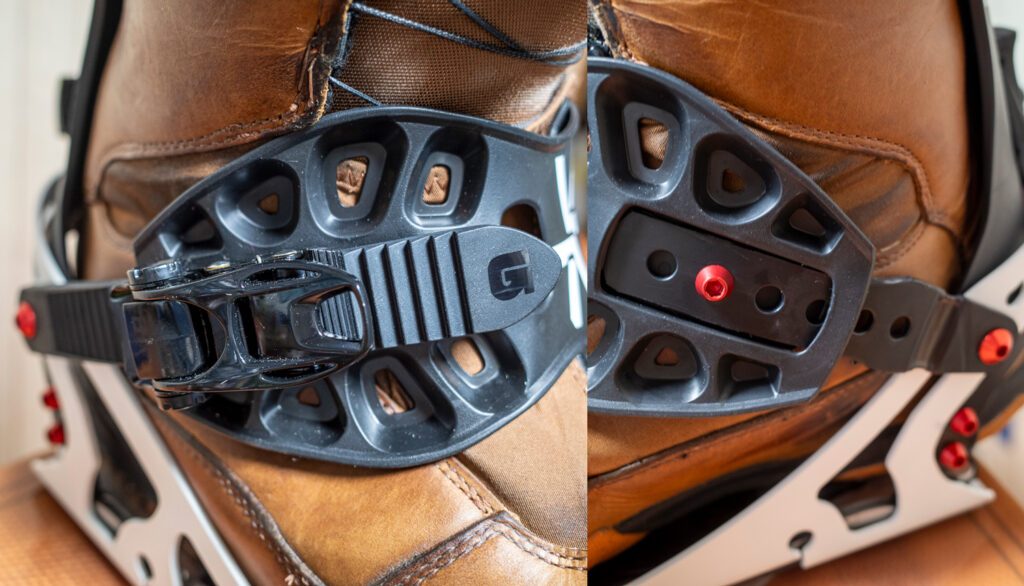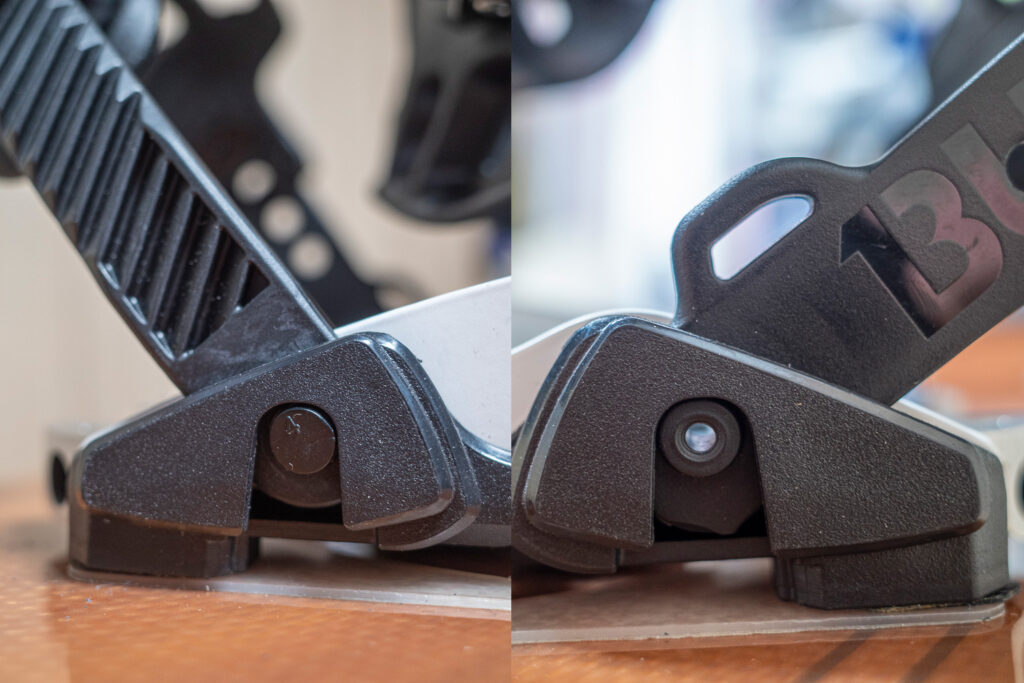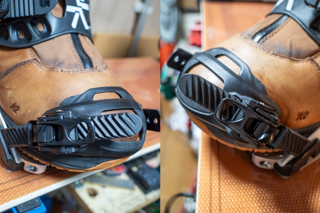 通常、ボードとバインディングは強固に固定されることが大前提となるので、そもそも語る必要のない箇所なのですが、簡単に取り外すことを前提としたスプリットボード用バインディングとなると話は違ってくる。